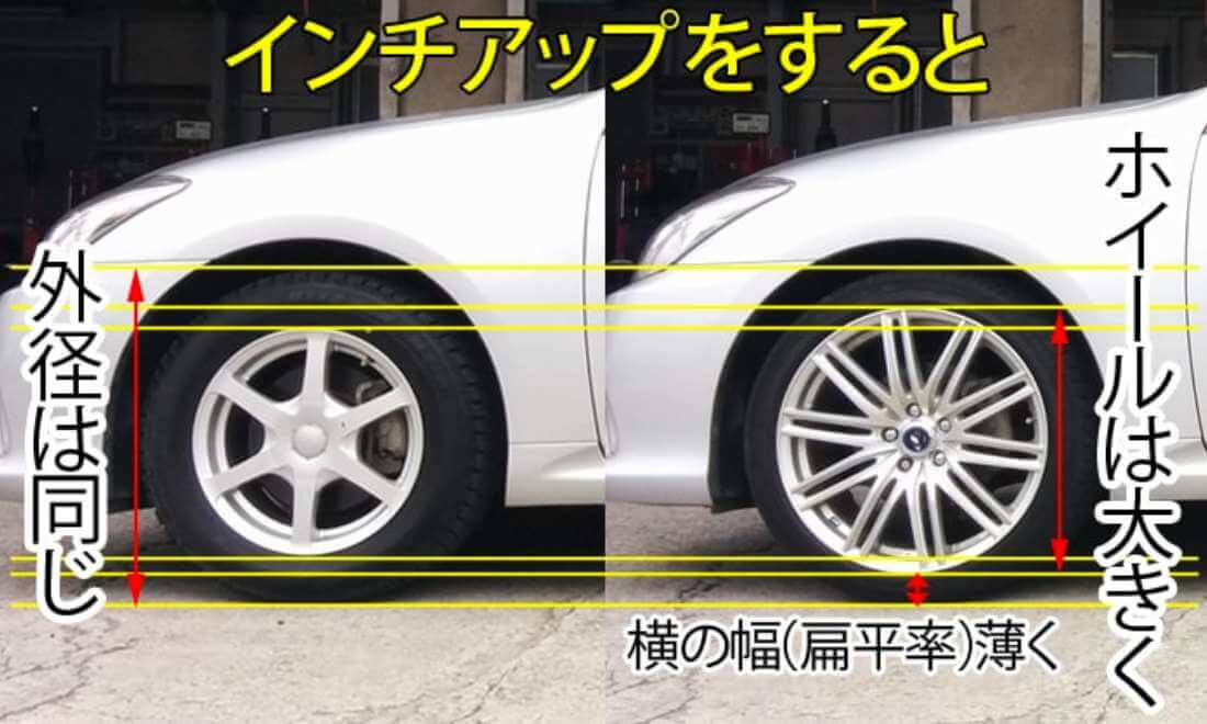 タイヤの外径はホイールの直径プラス大差の厚みで決まります。ホイールをインチアップした場合、タイヤの扁平率を下げて、外径は同じになるようにしなければなりません。